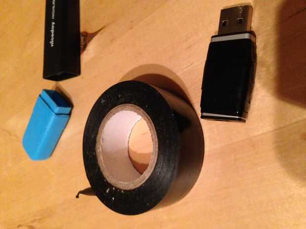Envuelva un USB con cinta eléctrica para aumentar el tamaño para sentarse cómodamente en el vacío dentro de la pluma del highlighter.