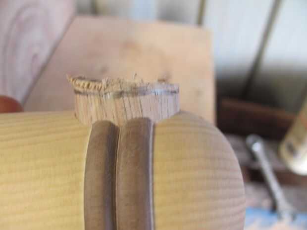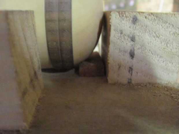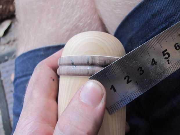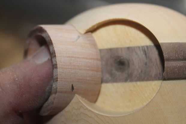Con motivo de las posiciones del agujero encontrar su centro. Encuentra este alineando la veta de la madera. Tienen una línea hacia abajo en el centro de la banda ojo y marcar la distancia del radio de los bordes de la banda (Foto 5). Esto le dará a sus centros. Durante la perforación, el punto debe sentarse en la ranura de la banda. Como la venda del ojo es el mismo diámetro que la base, necesita empacar para un agujero recto pero decidí dar una fracción de la gran uno (foto 11).