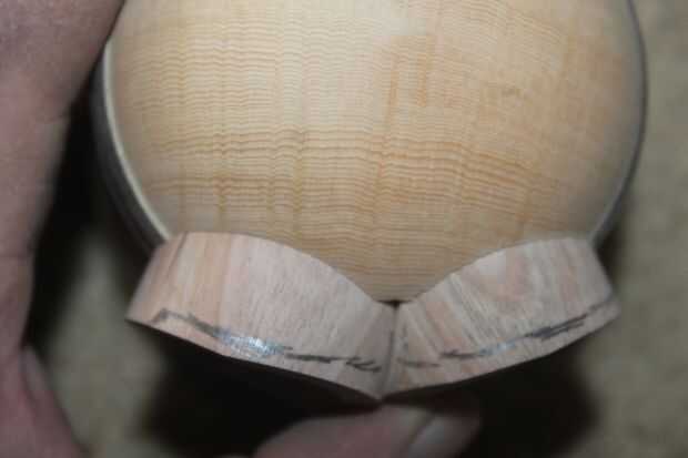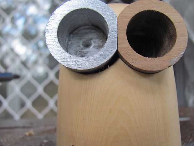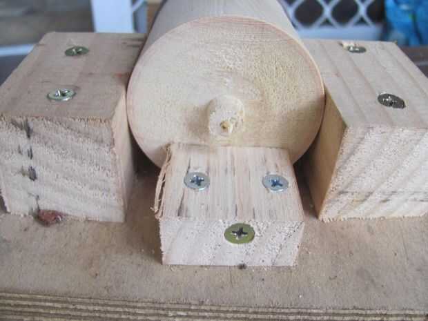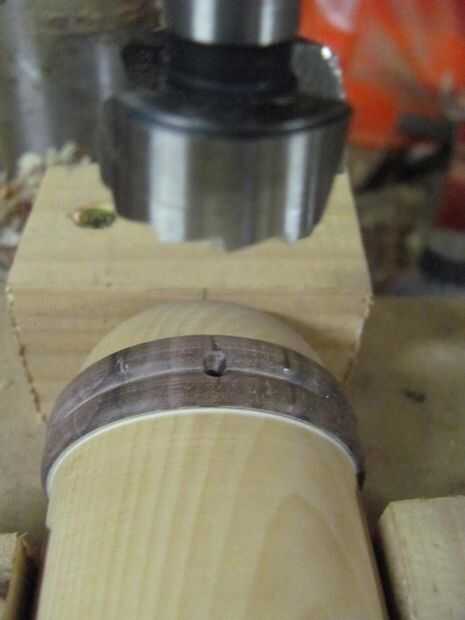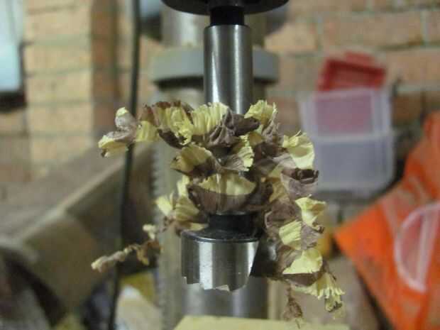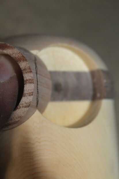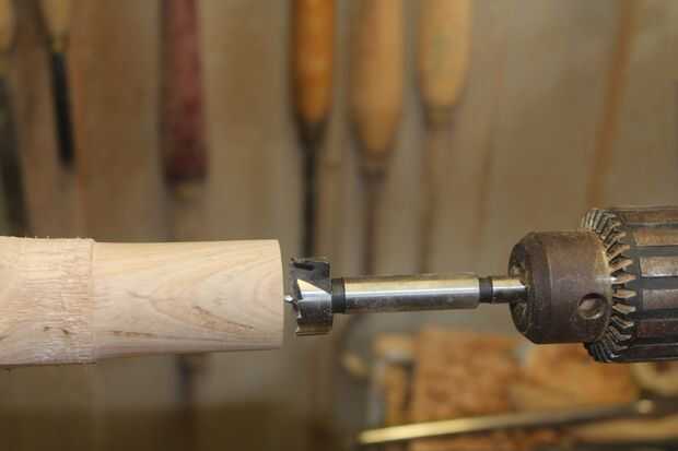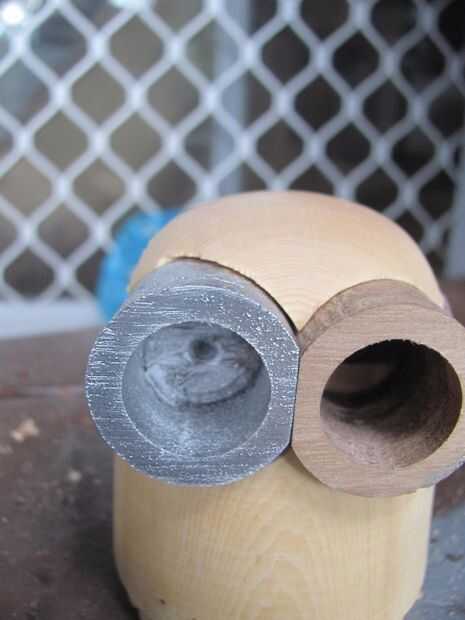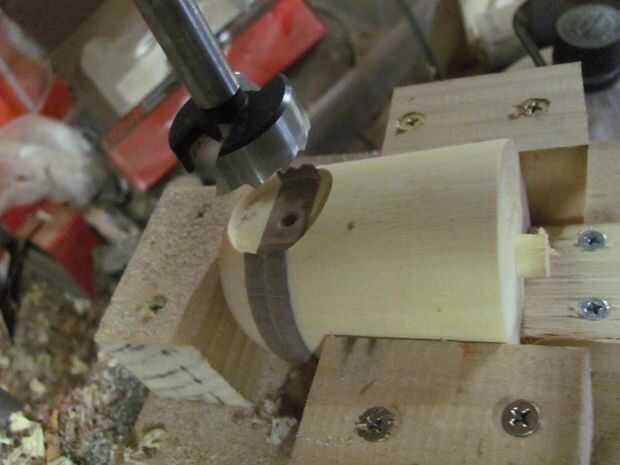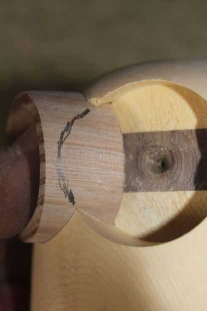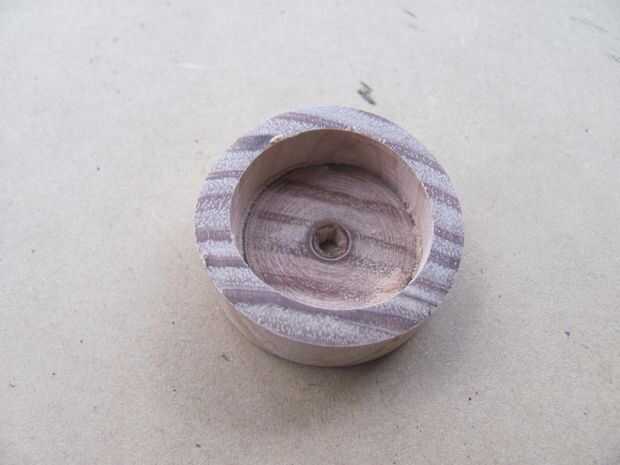 El giro de los ojos es simple pero tiene que ser hecho con precisión para conseguir un ajuste perfecto. Vuelva a 2 para llegar apenas a la derecha. Tiene un bloque de residuos con el agujero de diámetro entonces mismo para comprobar su diámetro para un buen ajuste. Usted no quiere demasiado apretado pero se verá claramente una brecha. Con el portabrocas jacobs y un pedacito de forstner, perfore el centro. Dar una luz de arena grano 240. No quieres cruzar lijar pero no quiere llenar el grano de polvo.