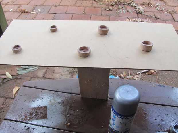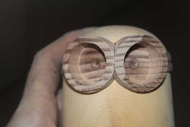 Hice un pedazo de experimento antes de empezar estos. Para perforar los agujeros utilicé una broca forstner en el taladro. Aunque yo aunque estaba sosteniendo firme, vagó. Fotos 1 y 2 muestran los huecos que quedan cuando salen los ojos, que eran un ajuste apretado. Tuve que hacer una plantilla para asegurarse de que esto no ocurriría.