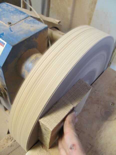 Similar a la nuez eyebands, necesita laminar piezas para obtener tamaños de mi. Después de que había puesto el pegamento, lava un lado sobre la lijadora. Lo más probable es que no será perfecto ya que los bordes redondo un poco pero lo mejor posible. Utilice un borde recto de una regla para comprobar. Marcan un aproximado de diámetro 5mm más grande que usted necesita y corte en la sierra.