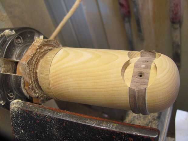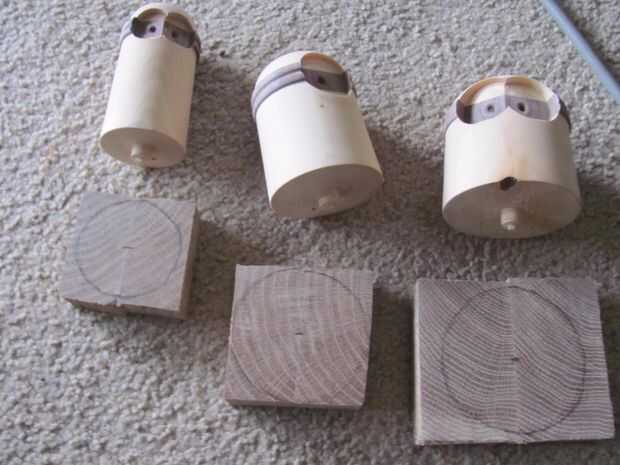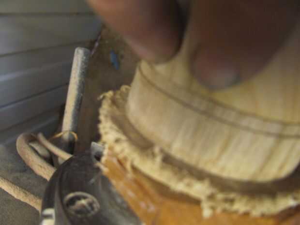 Usando un bloque de residuos diferentes, normalmente algo un poco más dura que el cedro, como el pino radiata, hace una mermelada de la tirada. Se trata de una pieza con una espiga de 12mm que el roble puede ser forzado sobre. (fotos 15-18). Debe ser lo suficientemente apretada como para que la pieza debe tener para cortes ligeros. Usted puede Agregar la presión de la acción de la cola con el otro era bloque para evitar marcas de los centros. Acabado que forma los lados, dejando un piso para las piernas.