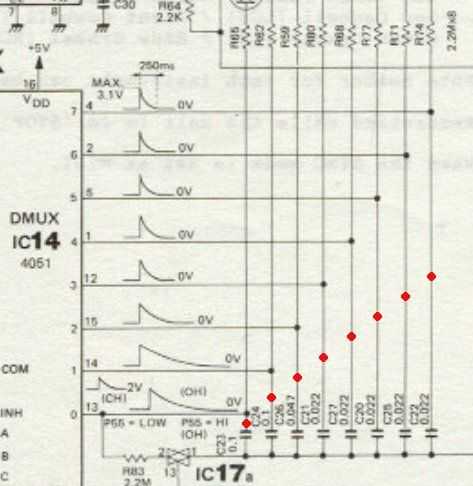 El propósito principal del mod es tomar los pulsos que activa los sonidos del tambor de la máquina. Son 8 en total y caome de un demultiplexor (4051). Se puede ver marcado en rojo en el esquema a continuación. Estos pulsos activarán los circuitos que encender y apagar nuestros juguetes.