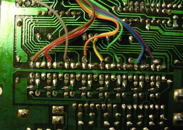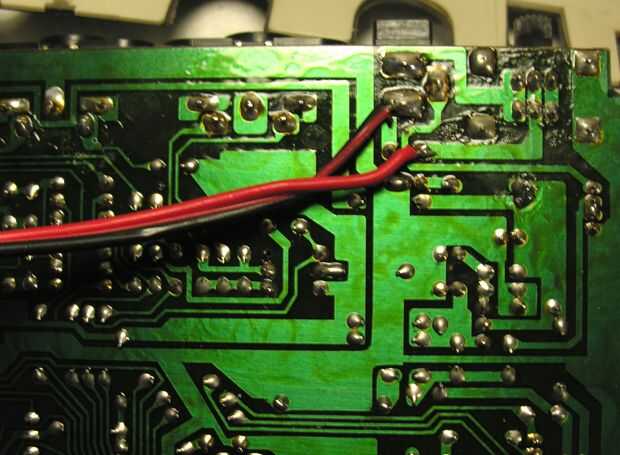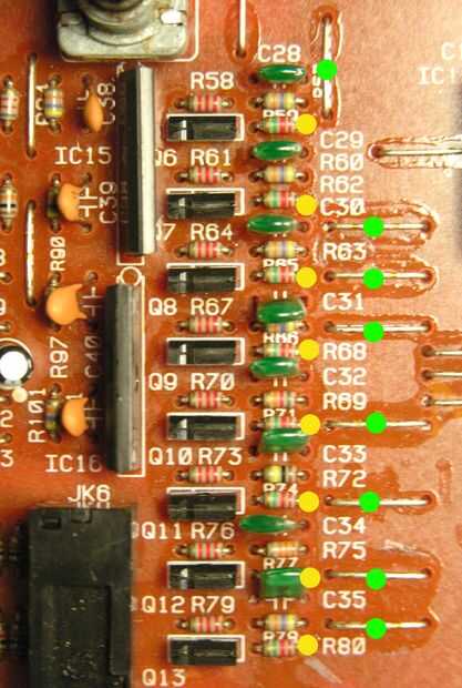 Desarma amorosamente tu 505 y busca los siguientes 8 puntos de conexión. Están identificados con un punto amarillo en la foto de abajo. De la resistencia están entre un condensador y una 2,2 M (código de color ROJO/ROJO/VERDE). Tendrás soldar cable de Naciones Unidas a este punto por debajo (ver imagen) o (más simple) soldar un los puentes de alambre superándose con el punto verde.