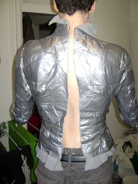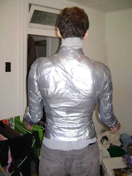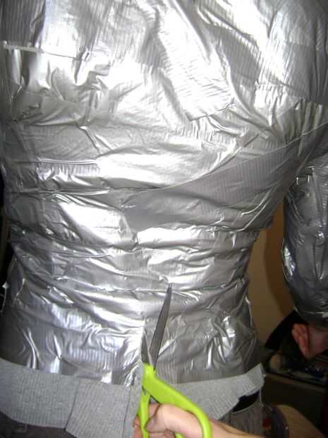 Tienen su puesto voluntario masculino en uno de los cuellos de tortuga y envuelven su torso y brazos en cinta. Cortar la cinta del conducto y camisa para quitarlo. Usted tendrá que cortar la columna vertebral y cortar hacia abajo de cada brazo.