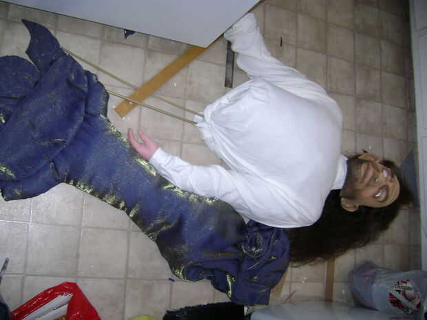 Poner la máscara en la cabeza de espuma de poliestireno y fíjelos con pasadores. Usted puede llenar la máscara con bateo pero primera cinta los agujeros en la máscara.