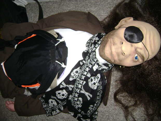 Había cubierto los orificios de ojos con cinta adhesiva desde el interior y luego agregó un parche en el ojo en una y dibujó el otro ojo con marcadores.