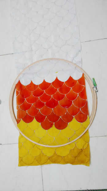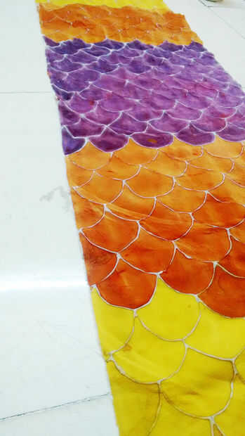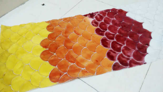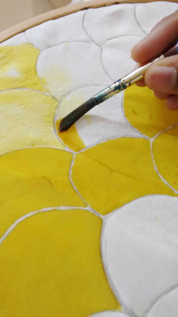 Ahora para el la diversión parte, tomar el tinte y pintura dentro de los patrones creados. El tinte naturalmente fluyen y cubren toda la zona marcada por la gutta. Asegúrese de que la tela se estira completamente mientras pinta. Si hay cualquier rapto en líneas de gutta el color fluiría hacia fuera. Mi tinte cambió su color después del secado, para evitar esto que se puede probar primero el color sobre una tela separada antes de utilizar en el diseño final.