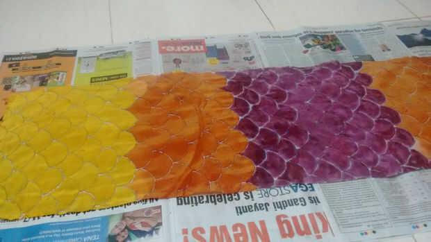 Una vez seca la tela, tiene que ser al vapor para fijar los colores permanentes. Para esta deformación de la tela en el periódico. Asegúrese de que la tela no se toca, como color transferiría en esos puntos.
