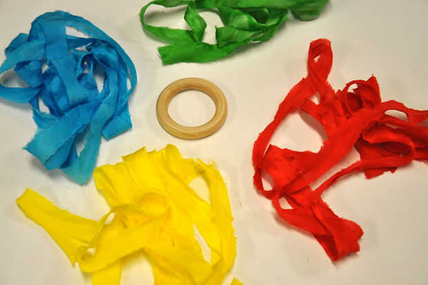 6. doblar una cinta por la mitad y pase el doblez a través del anillo/el brazalete, luego tire el extremo de la cinta a través del lazo para hacer un nudo de enganche. Repita para los otros colores. Usted puede jugar con la orden que ata las cintas.