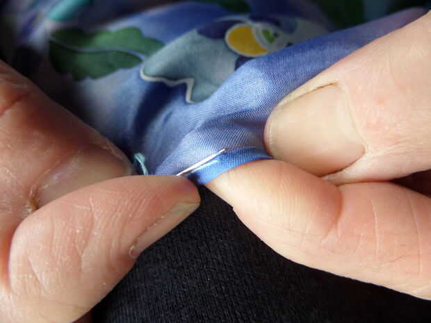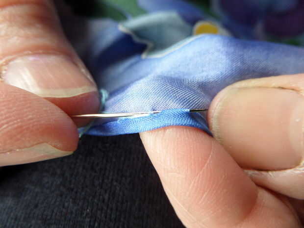 Pasar la aguja a través de un pequeño túnel de seda laminada en y hacia fuera para recoger el siguiente hilo minúsculo. Debo admitir que esto toma un tiempo y algo de paciencia pero da un buen acabado en el borde de la bufanda.