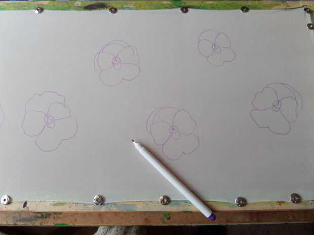 En primer lugar había trazado algunas formas de pensamiento flor en seda utilizando una auto fade la pluma. Estoy tratando de crepé de China de seda que me gusta por su peso y paño, seda habotai funciona bien también para los proyectos de la bufanda.