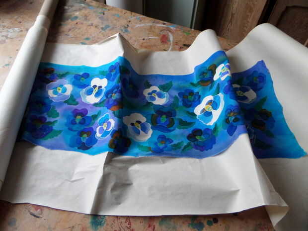 La última fotografía muestra la seda al vapor que sale de su papel, siempre un momento emocionante. Los colores son ahora fijos y listo para ser lavada y planchada.