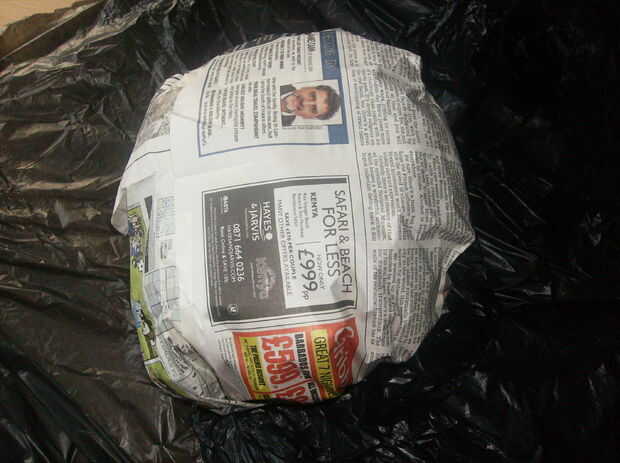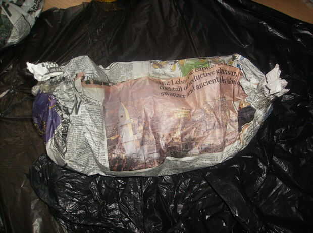 10 lugar de las bolas en una pieza abierta de periódico - el lado más largo en la parte inferior, este periódico sujetan sus entrañas. Cuando tengas las bolas en su lugar plegar el papel, cinta adhesiva en su lugar y apriete tuerza los extremos y doblar hacia el centro haciendo un paquete de bolas de papel. Puede modificar esto para hacer la forma de su cuerpo de las arañas. Una vez hecho esto celo en lugar.