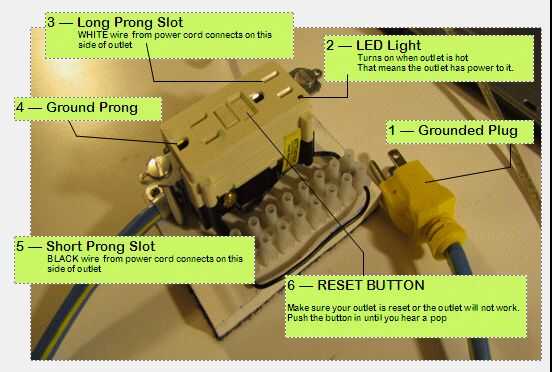 Tenga en cuenta que estamos utilizando una salida de Interruptor diferencial (GFCI) y no una toma de corriente normal. El GFCI puede salvar su vida. Es el tipo de salida se encuentra cerca de cualquier cosa que salidas de agua (fregaderos, tinas de baño, etc.). Cuando la salida detecta una cantidad anormal de la corriente, asume que una gran cantidad de corriente potencialmente mortal está fluyendo a través de su cuerpo y por lo tanto se apaga - ahorro de usted y su proyecto.
