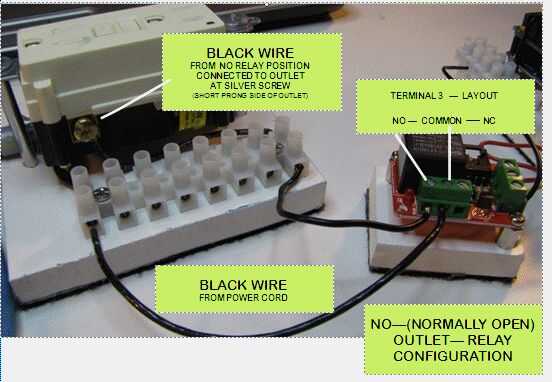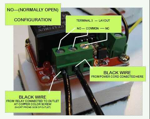 Cable negro de potencia cable esté conectado al tornillo "Común" de la Terminal 3 del bloque en el relé. Sería la conexión del centro cuando se mira directamente al frente de la caja de bornes. (ver no cuadro configuración - (normalmente abierto) - si cualquier pregunta acerca de esta conexión)