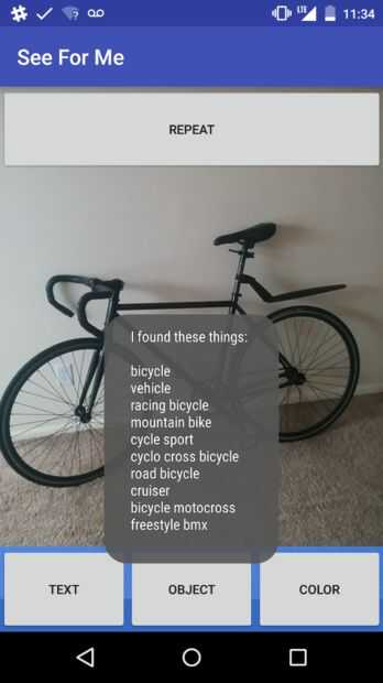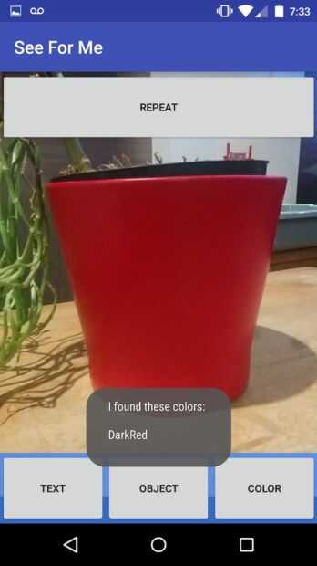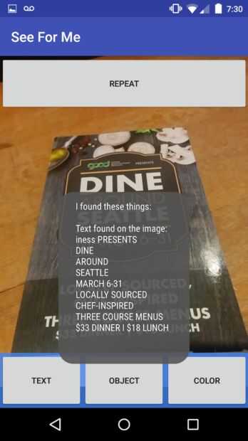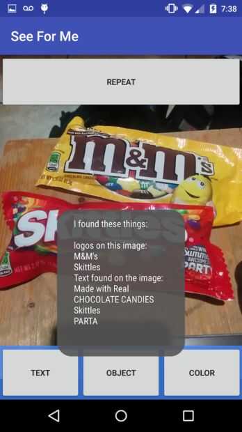SeeForMe es una aplicación Android que integra con el programa de accesibilidad TalkBack, proporcionando información hablada en tres modos posibles de procesamiento Foto: objeto, texto y el reconocimiento de color. Los usuarios con discapacidad visual son más capaces de entender su entorno con la ayuda de la aplicación de SeeForMe.