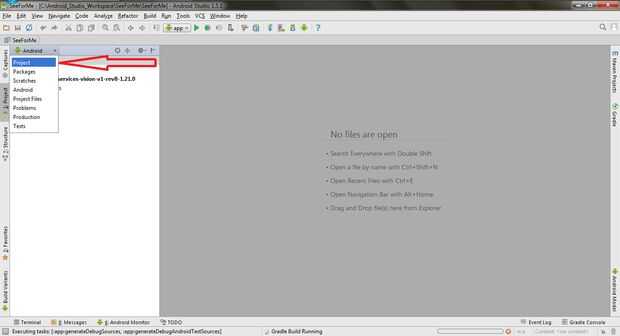 A la izquierda, tendrás que cambiar la vista del proyecto Android, desde el valor por defecto Android vista del proyecto, a la vista de proyecto como se indica en las imágenes.