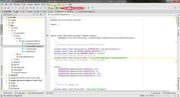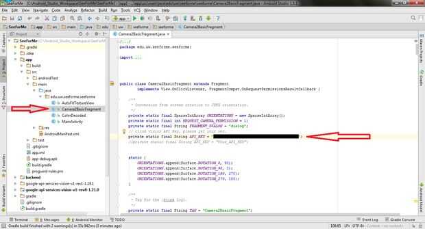 Una vez que usted abra el archivo Camera2BasicFragment, puede encontrar la ubicación adecuada para colocar tu propia clave de API del paso 1.