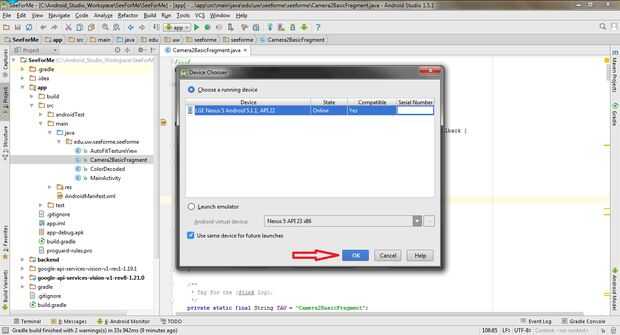Pulsa el botón de funcionamiento como se indica, seleccione su dispositivo y esperar a que la aplicación de SeeForMe para construir a tu teléfono.