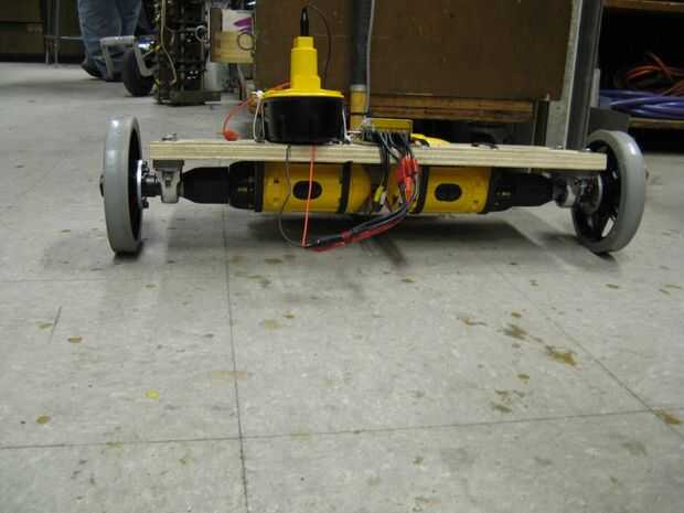 El palo se atornilla en el lugar, los componentes electrónicos están cableados y todo se recorta con una batería de DeWalt de 18V. (Sugiero prueba ruedas-para arriba con una fuente de alimentación primero).