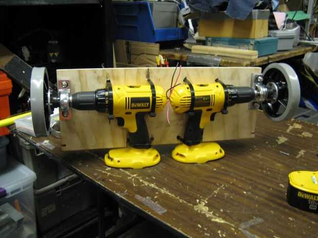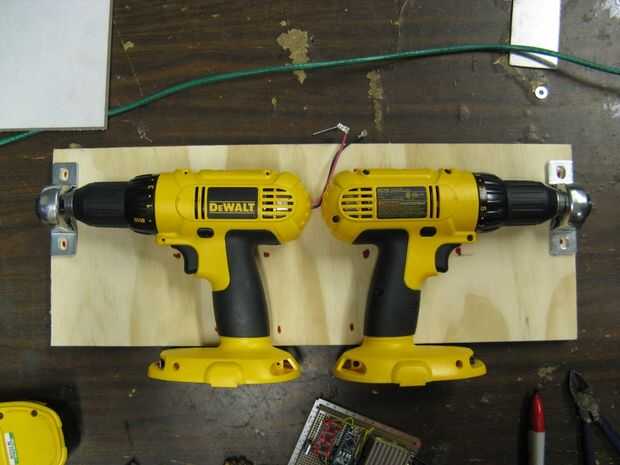 El proceso: cortar un pedazo de 3/4" madera contrachapada para las dimensiones de la cubierta (donde pones los pies), que también llevará a cabo los ejercicios, rodamientos y eventualmente la electrónica. Luego, marcan unos agujeros para los cojinetes y ataduras de cremallera extra extra grande mantener el taladro en su lugar. Abrazaderas de manguera podrían funcionar también. Entonces, todos los agujeros perforados.