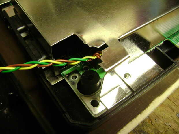 Antes de completamente volver a montar esto, usted probablemente ha notado que la pantalla pueda estar bloqueando los alambres para el interruptor. Cortar el escudo. No cortar si encuentras una mejor ubicación.