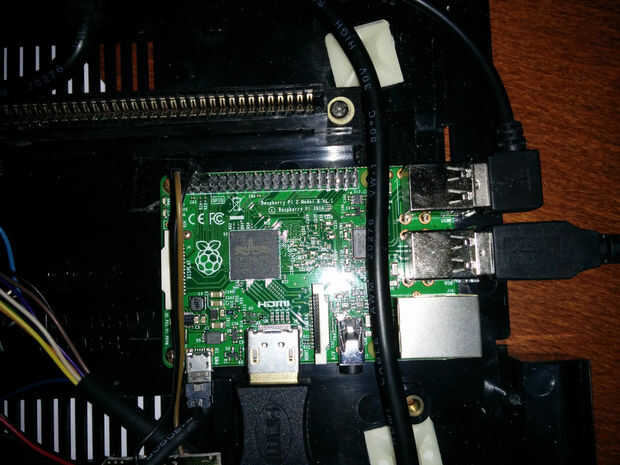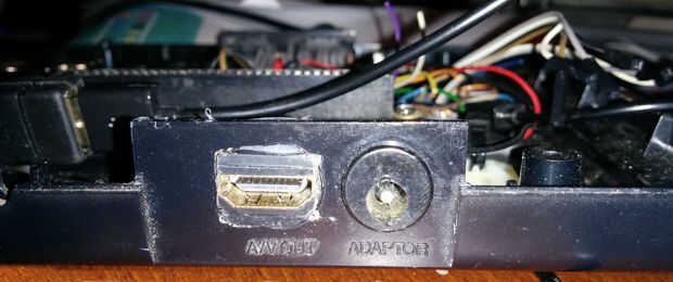Por último para esta fase enchufé el cable de HDMI. Esto fue un ajuste dado donde coloqué el PI y requería algunos afeitado cercano de la sección de la placa base que conservado para los conectores DB9. En el extremo hembra del conector había afeitado 1-2mm todo por lo que tiene un paso pequeño que cabrá a través del lado de la caja. Utilizando un pequeño archivo suavemente corte existente redondo agujero hacia fuera para que sea rectangular y se deslizó el conector a través de modo que quede alineada con la parte exterior de la caja. He pegado una pequeña pieza de plástico bajo el conector para y utiliza silicio para mantener en su lugar. No un trabajo perfecto, pero podemos vivir con él ya que es alrededor de la parte posterior.