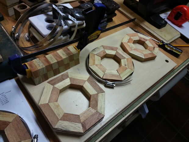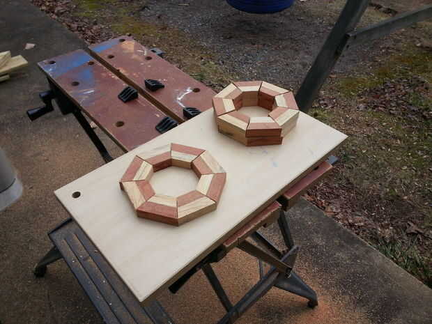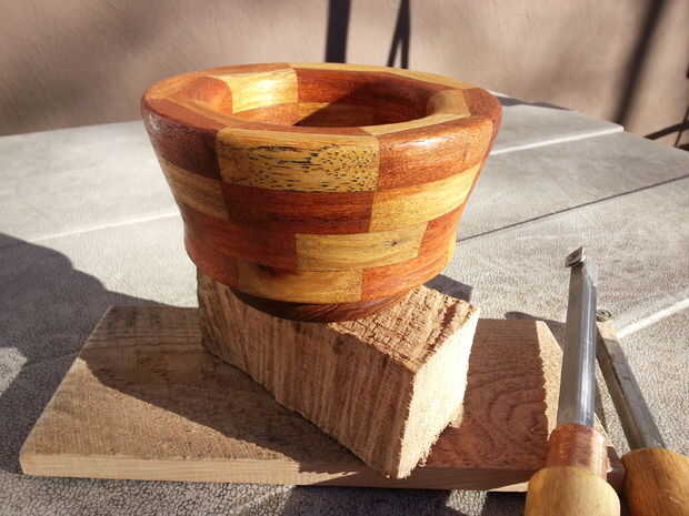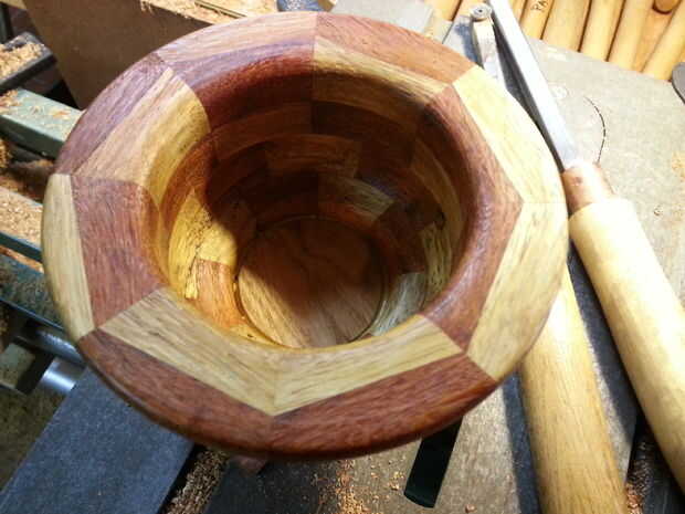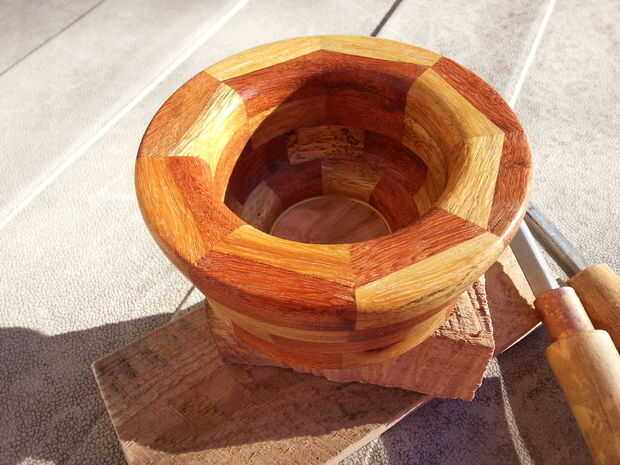 He querido intentar hacer un recipiente dividido en segmentos durante mucho tiempo. Mientras que vagando por la ferretería unas semanas atrás me encontré en algunas estacas de jardinería que tenía algún grano agradable. Se fueron un poco torcidas pero costo sólo $2,99 y algún tipo de madera dura así que pensé que le daría un ir. Cortar a ángulos de 22,5 grados (para los 8 anillos a un lado), funcionó un pequeño cepillo eléctrico sobre ellos y había pegado encima. La base es una pieza de caoba de chatarra que da un bonito tono contrastante. El torno es $100 puerto de la carga especial y las herramientas son caseros (sobre $10 a $15 cada uno) con valores cuadrados y fresas de metal duro. Realmente, nadie puede hacer esto con algunas herramientas muy básicas. ¡Que te diviertas! Gracias por echar un vistazo.