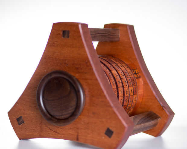 Cortar cada extremo, marque cuidadosamente los centros y luego la arena y los bordes de la ruta. En ambos lados, use un serrucho en una prensa del taladro para cortar hendiduras para colocar las espigas en los anillos. Usé un tornillo Glaser a cortar cada uno en su lugar. Añadir un hueco más pequeño en el lado derecho de la sala del centro pasar.