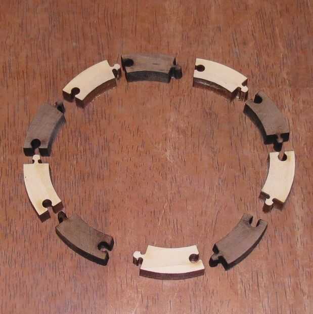 Montar los anillos puede llegar a ser tedioso, así que para ayudar a evitar los errores primero coloque los segmentos para un anillo en el orden correcto. Yo agregue el pegamento a la cerradura de un segmento, coloque sobre la clave del segmento adyacente, luego suavemente golpéela hacia abajo en su lugar con un martillo. El martillo es necesario para asegurarse de que los segmentos completamente mate debido al ajuste de interferencia de la clave del diseño. Repita con cada segmento hasta que el anillo se complete. Ahora juntar todos los anillos restantes.