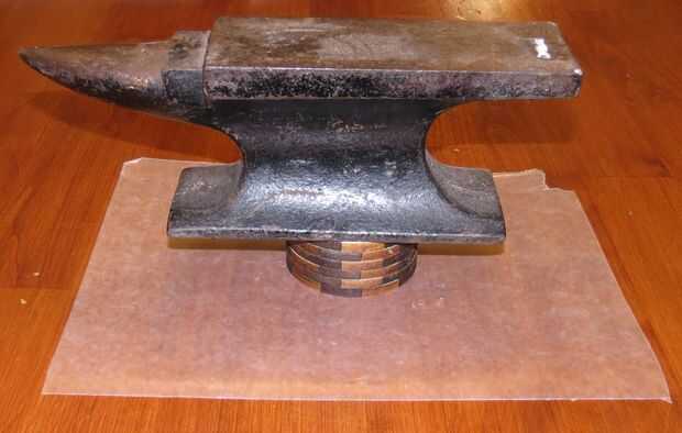 Aquí es donde usted puede ser creativo y decide qué tipo de patrón que desea crear cuando apile los anillos.  Una vez que selecciona un patrón, empezar a pegar los anillos uno a la vez.  Aplique una capa delgada de pegamento en la parte plana de un anillo, establecer otra en la parte superior, finalmente ajustar su rotación y colocar algo pesado encima para mantenerlas juntas hasta que el pegamento seque.  Obviamente puede usar un conjunto de pinzas si usted las tiene, pero me acaba de pasar que un yunque pequeño que funcionó a la perfección.  Repita hasta que usted pega toda la pila.
