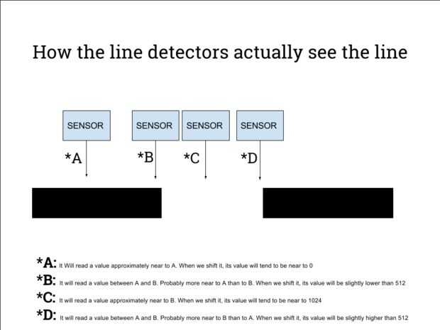 Este es tal vez un paso simple, pero utilizando este algoritmo simple hará que el robot siga la línea de la misma manera en diferentes pistas con diferentes condiciones de luz. ¿Por qué necesitamos calibrar los sensores cny70? Porque aunque ya he dicho anteriormente que este sensor da un 0 para un 1024 para blanco y negro, realmente no tenemos casi nunca un redondo 0-1024 porque no hay ninguna pista donde su blanco refleja 100% de la luz y su 0% negro. En el mundo real vamos a obtener probablemente un valor, sólo podemos llamarlo para la más oscura oscuridad de la pista y otro valor, llamar al B, para el blanco más brillante. Es cierto 0 < = A < = B < = 1024. ¿Cómo calibra el robot? Antes de que el robot Comience siguiendo la línea necesitamos mover la línea de seguir sensor de matriz para hacerlos leer todo completamente negro y la parte blanca de la pista.