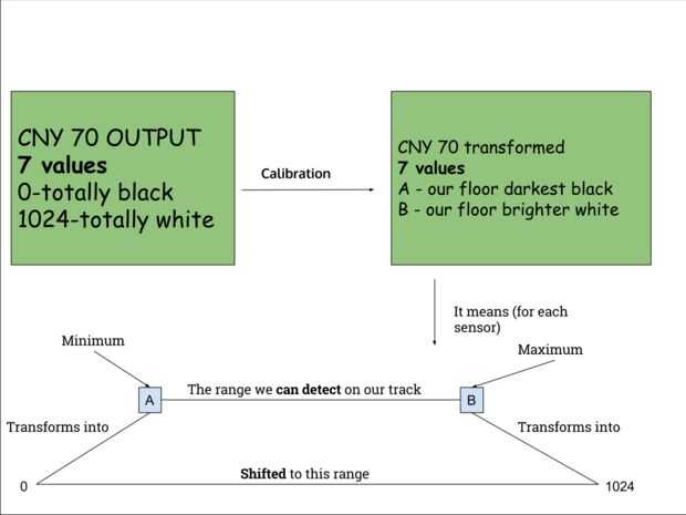 Así que cuando termina el tiempo de calibración, nos pondremos los 7 valores leídos por el sensor en la matriz C. cada sensor tiene su amin (A) y su valor de amax (B). Luego en el programa sólo convertimos el valor leído (A-B) para el rango (0-1024) mediante simples de matemáticas. Si ocurre que lea un valor inferior A entonces consideramos que leer A y si se ocurren leemos un valor mayor que B entonces consideramos que leer B.