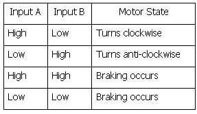 Utilizará la IC L293D para el control de los motores que funcionan con E/S digitales. Asumir que la entrada al motor L293D es HIGH("1") y LOW("0"), que hará que los motores para girar en dirección a la derecha, del mismo modo cuando las entradas son LOW("0") y HIGH("1") el motor girará en sentido antihorario. Pero cuando las entradas de ambos son el mismo (1 y 1 o 0 y 0) los motores no funcionan.
