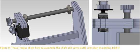 Montar el eje y el servo, con ninguÌ n pegamento y alinee las dos poleas de correa de tiempo como se muestra en la figura 9. Algunos de la barra deben estar expuestas de la pared opuesta a la polea.