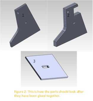Unir los recortes correspondientes como se muestra en la figura 2, utilizando el pegamento. Usted debe ser capaz de mirar a través de los recortes y ver que todos los agujeros estén alineados, la base de las piezas 1 y 2 debe ser plana, y una plantilla en la parte 3 debe estar mirando hacia fuera.