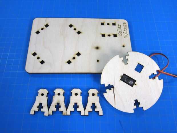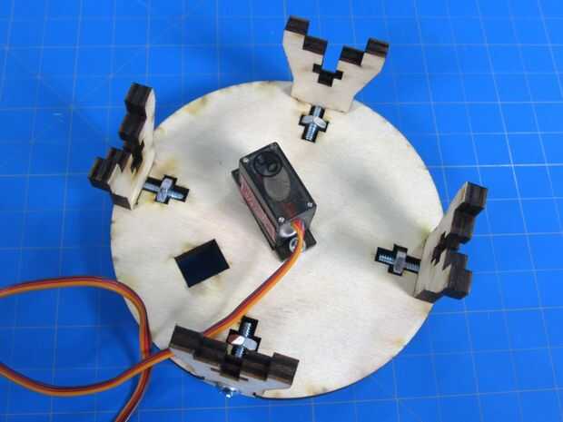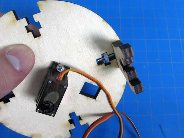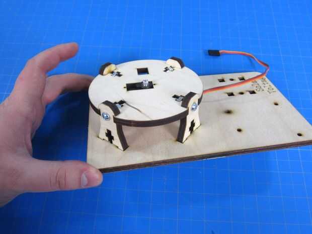 Ahora caben las cuatro patas en la base. Asegúrese de que al hacer esto el cable del servo se coloca de modo que sale hacia la parte posterior donde va a ser nuestra electrónica.