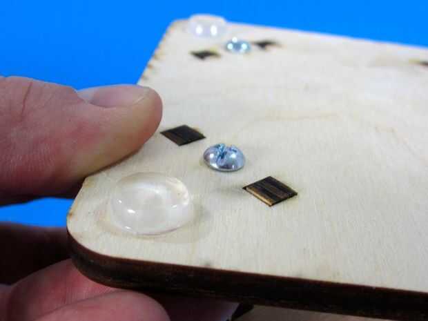 Por último, coloque las cuatro patas de goma en la parte inferior de la placa base para que las cabezas de los tornillos no rayar su superficie de trabajo.