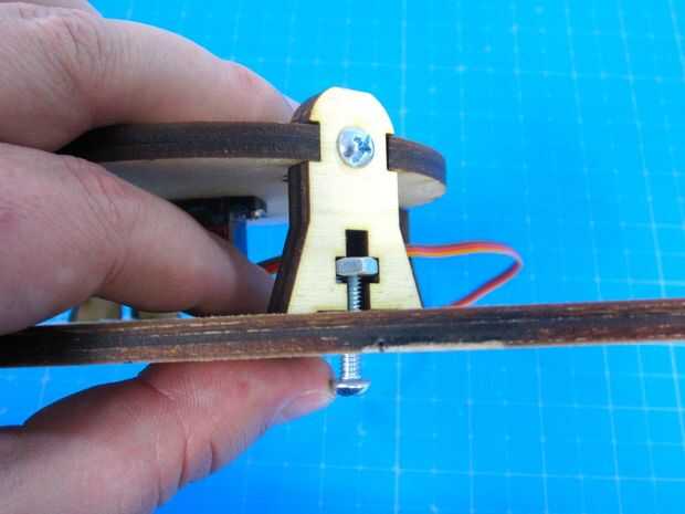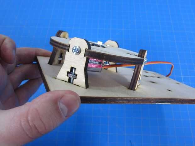 Una vez que nuestras piernas se enroscan en la placa base volver y apriete los cuatro tornillos que unen las piernas al soporte servo redondo.
