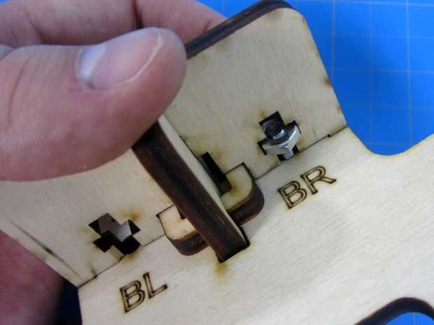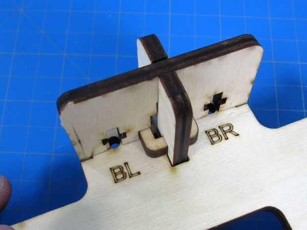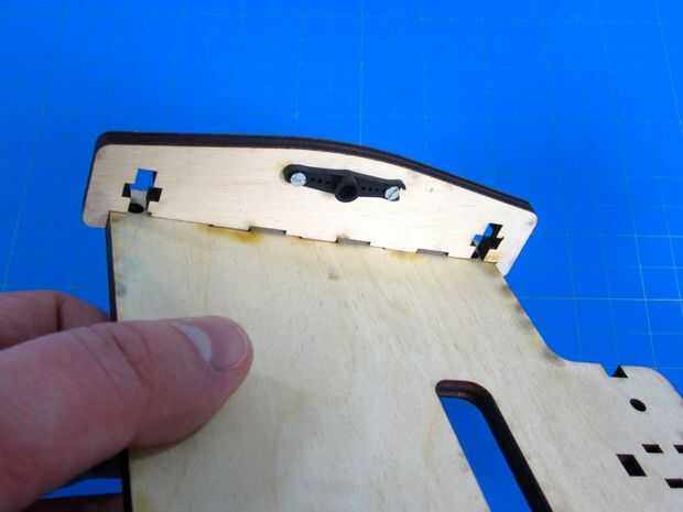 Poner la placa sobre la mesa delante de usted para que usted pueda leer las palabras. Coloque el pedazo de triángulo del ala con el brazo del servo a la derecha y la otra pieza del ala de la triángulo a la izquierda. Queremos que el brazo del servo de plástico a ser hacia el interior.