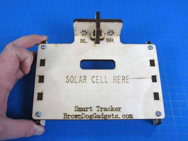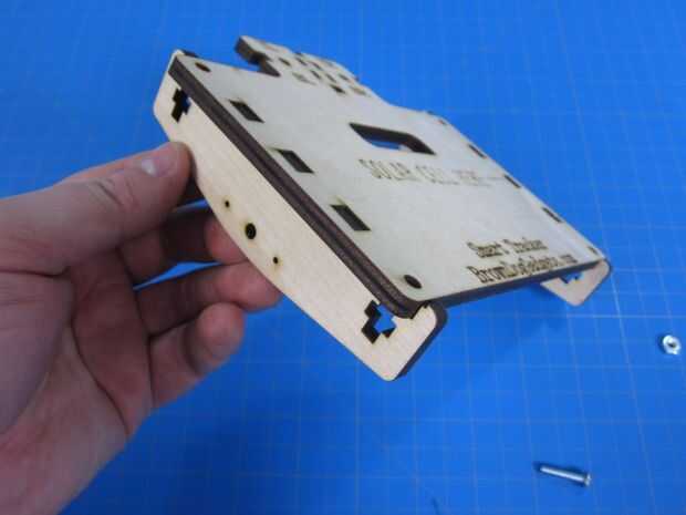 Agarrar la cara del arsenal solar grande. Es la que dice "célula Solar" en él. También necesitaremos las alas dos triángulo, la pieza cuadrada de pequeñas esquinas redondeadas y las dos piezas de divisor de sensor pequeño. Para conectar todo necesitaremos seis tornillos 6-32 y tuercas.