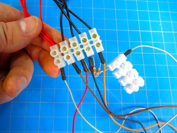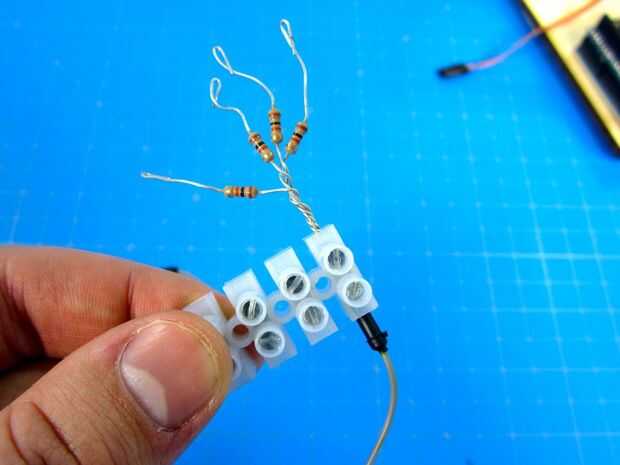Trence los cuatro resistores y ponerlos en uno de los agujeros en el bloque 4 de Puerto. En el tornillo opuesto del agujero en un puente. Ese puente es nuestro común negativo.