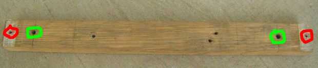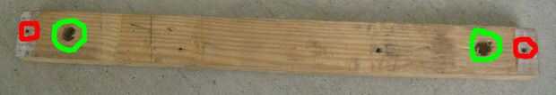 Taladrar orificios para los tornillos de madera de 3/4" según lo indicado por las marcas rojas en la imagen.   Taladre los agujeros para los pernos según lo indicado por las marcas verdes.  Si los pernos no caben sus ejes totalmente a través de la madera, pueden perforar los agujeros lo suficientemente anchos como para las cabezas de los pernos según lo indicado por la marca verde en la 2 º foto de este paso.  La distancia entre los agujeros verdes debe ser igual a la distancia entre los orificios de montaje en el panel solar.