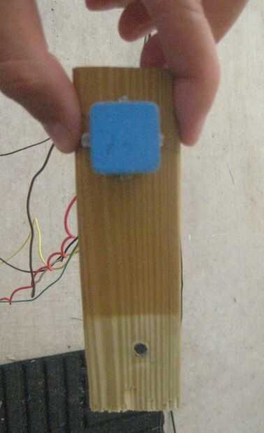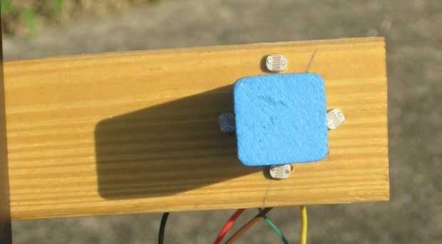 Haga un agujero para un perno a través de wood7. Luego perfore agujeros pequeños 8 para los plomos de la fotorresistencia. Asegúrese de que estos agujeros pueden rodean wood8. Estos agujeritos son 2 agrupadas por fotorresistencia. Cuando usted haga estos agujeros, inserte un fotoresistor en cada par de agujeros. Puede utilizar pegamento para asegurar los fotorresistores.