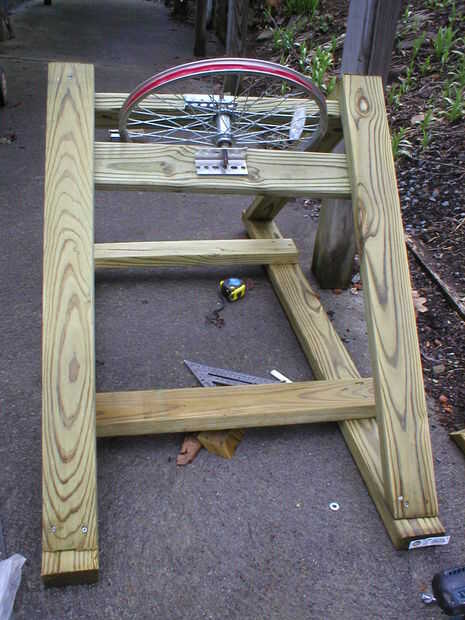 Para hacer un bonito, resistente base cortar 2 x 4 ángulos y ponerlos juntos para hacer dos triángulos. Usted puede hacer cualquier tamaño que usted necesita, dependiendo del tamaño de los paneles. Luego até a ellos junto con un par de 2 x 4 en la base y un par más arriba. Esto hizo que un robusto agradable, base para montar las ruedas.