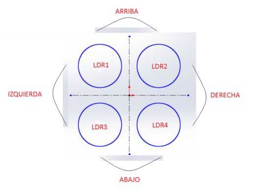 Los LDR (fotorresistencias) parte un elaboró en lugar existe más luminosidad durante el día, estas se colocaron en los vértices del panel, agrupados de tal manera se puede observar en la figura anterior, es decir, un par en la parte superior y un par en la parte inferior. Para lograr una mayor espectrofotómetro en cuanto a la medición de la luminosidad se deben cubrir las fotorresistencias alrededor para evitar la captación de la radiación solar difusa, en otras palabras, la propagación de las luz (ondas electromagnéticas) se encuentran esparcidas y reflejadas en la atmósfera.