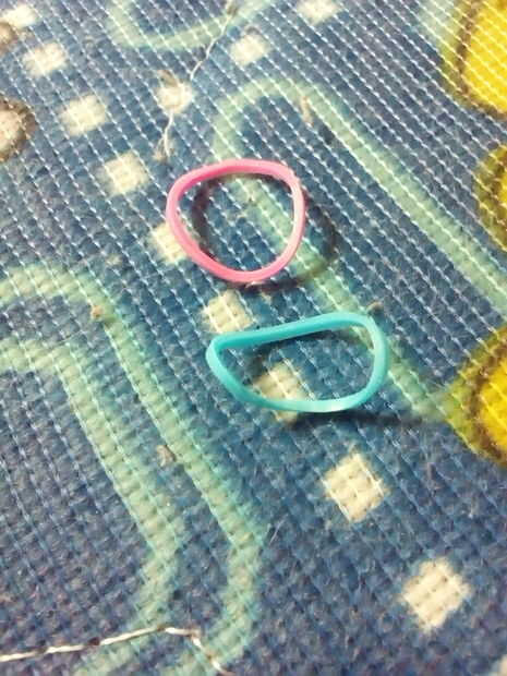 en primer lugar reunir solamente 2 bandas de goma o los titulares de cola de caballo para hacer un anillo o pulsera