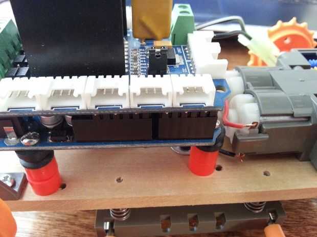 Teniendo cuidado de no doblar pernos, alinee las clavijas del Motor protector con las ranuras en el Arduino y presione hacia abajo hasta que el escudo del Motor está seguro en el Arduino.