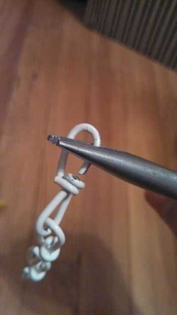 Una vez que se cortan los vínculos, las manos enguantadas y alicates para abrir el enlace en un gancho de la aguja. Era capaz de hacer fácilmente con sólo el juego de alicates pero puedes emplear otra si resulta demasiado difícil o demasiado pequeño para manejar.